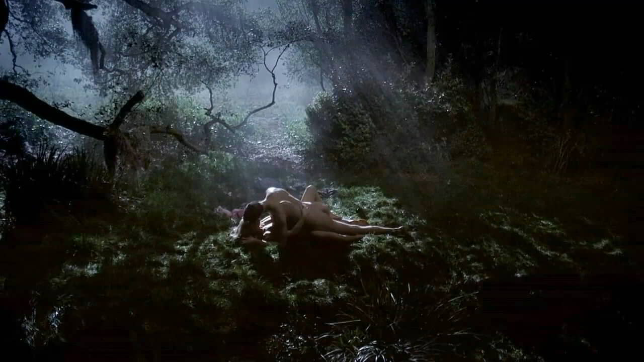 In another scene, Anna Paquin lies naked on her back under the moonlight. She’s on a grassy hill, having sex with a man who’s on top of her. Her bare breasts are fully visible as they move together.