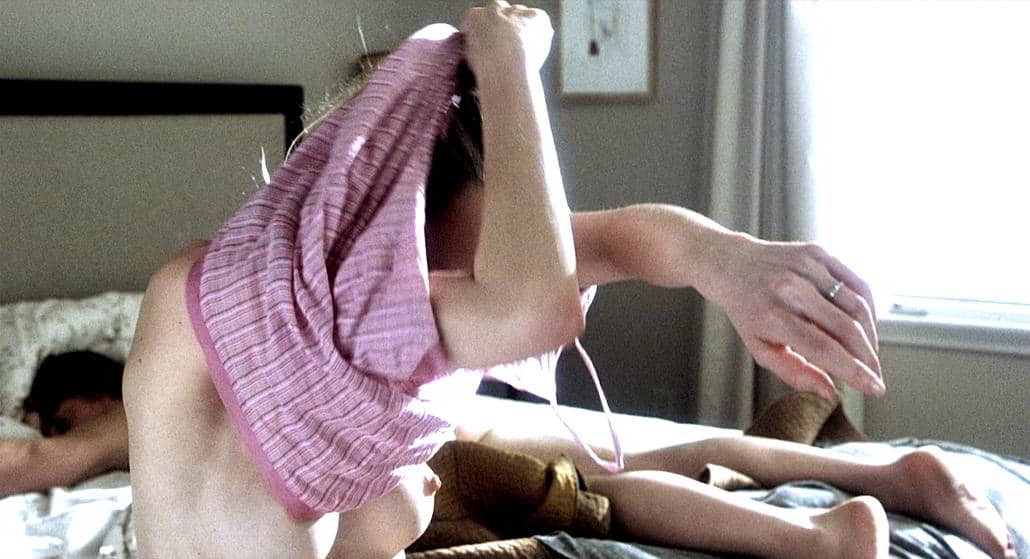 In the 2003 movie 21 Grams, Naomi Watts reveals her stunning nipples and naked breasts in a steamy scene where a man grabs and sucks on them while pleasuring her orally. Soon after, she climbs on top of him, and they have passionate sex. In another moment, Naomi Watts is shown sleeping topless in bed, lying on her side with her left breast peeking out from under her arm, fully exposed. Later, she’s seen sitting at the edge of a bed, still topless, her beautiful breasts on display before she slips into a pink shirt.